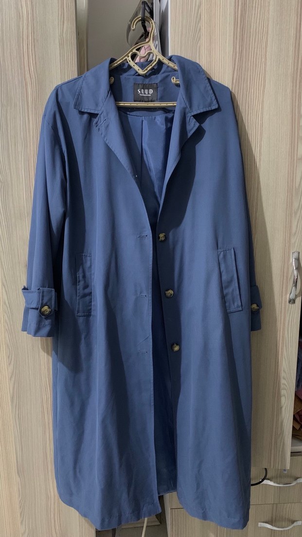 Uzun trençkot, düğmeli ön, kesik yaka ile. Parlak, ipeksi kumaştan, uzun kollu ve günlük kullanım için rahat kesim. Defosuz az kullanıldı