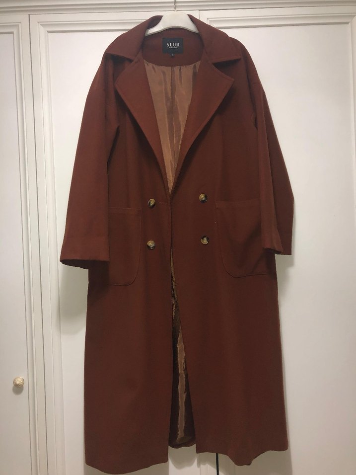 Kremit rengi süet kumaştan yapılmış, uzun kesim ve düğmeli ön kısmı olan kadın kabanı. Notched lapel yaka ve uzun kolludur, rahat bir loose fit sunar. Günlük kullanıma uygundur.