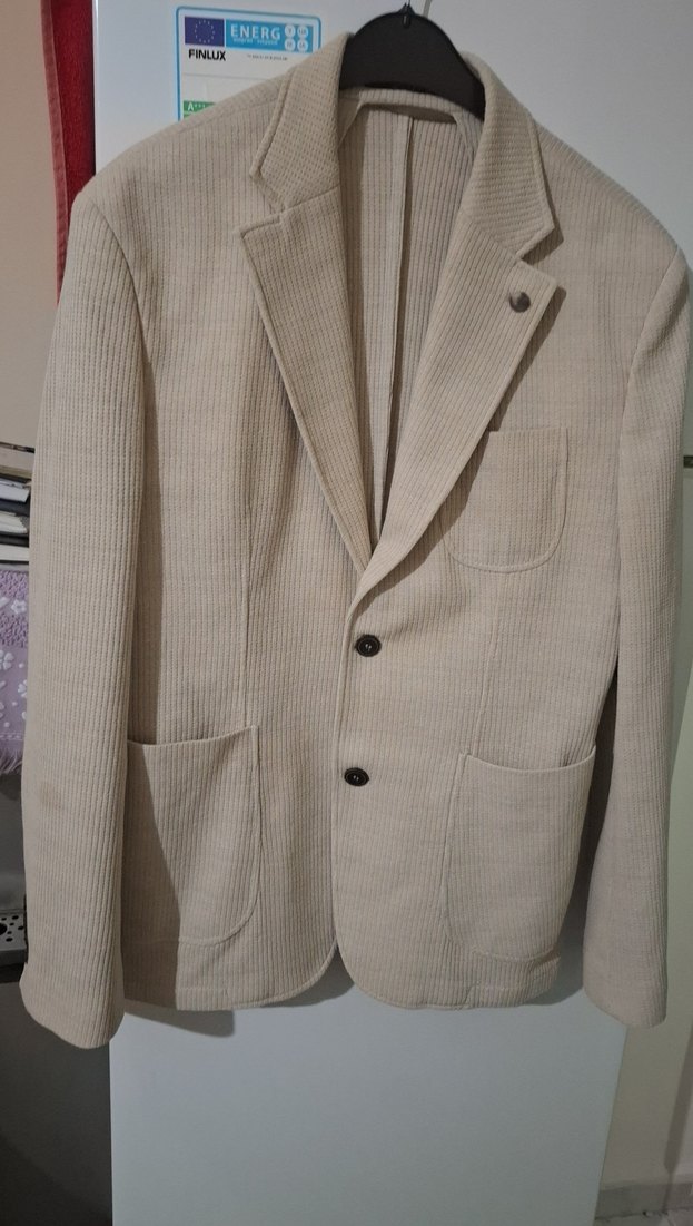 Süvari/Bej renkli, düğmeli, Slim Fit erkek ceket. %50 si pamuk kumaştan, ofis ve sokak tarzına uygundur. Sağ kolunda çok belirgin değil ama alkol lekesi var. Fotoğraf daki gibi.