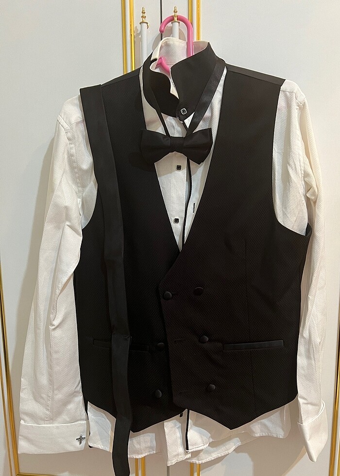 Sadece düğünde giyilmiştir. Kravat papyon pantolon gömlek süveter