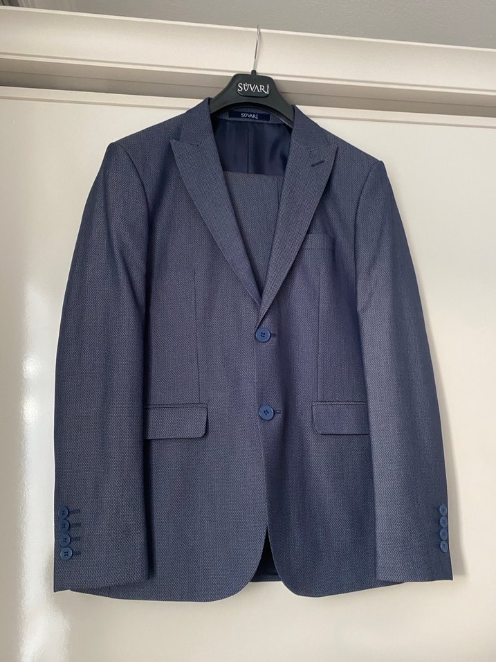 Lacivert erkek takım ceketi, kesik yaka ve düğmeli detaylara sahip. Uzun kollu ve normal kesim, ofis için uygun modern klasik tarzda. Süvari marka 1 kez giyilmiştir. Kuru temizlemesi yapılmıştır. Pantolonuda mevcut takım şeklindedir.