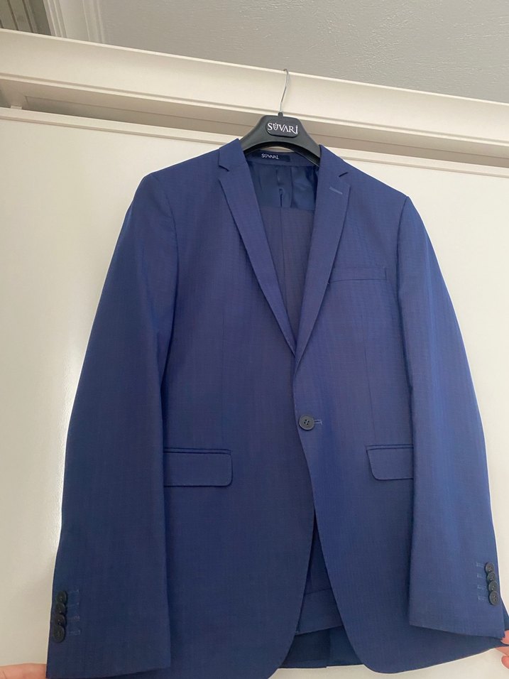 Düğmeli, mavi renkte, uzun kollu ve normal boyda erkek takım elbise . Modern klasik tarzda ve iş ortamına uygun. SÜVARİ MARKASINDAN 1 KEZ GİYİLMİŞTİR. KURU TEMİZLEMESİ YAPILMIŞTIR. Takımdır pantolonuda dahildir.