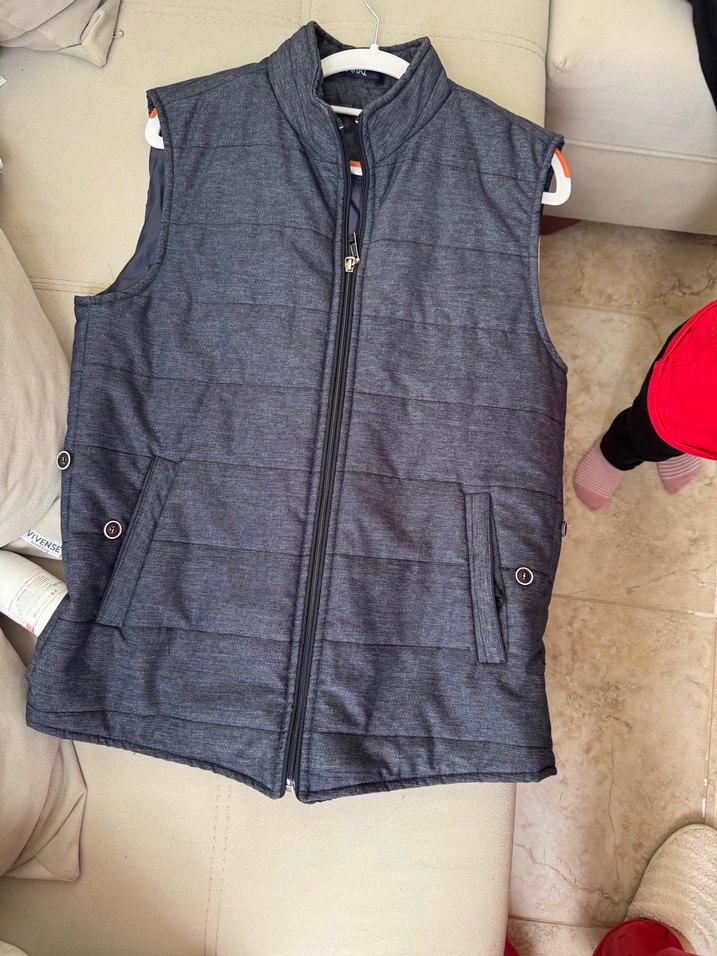 Fermuarlı, yüksek yakalı, gri denim erkek yelek. Düz renk ve normal kesim, günlük rahat kullanıma uygun. Eşim normalde M beden giyen biri bu yelek 48 beden ve eşime tam oluyor haberiniz olsun.