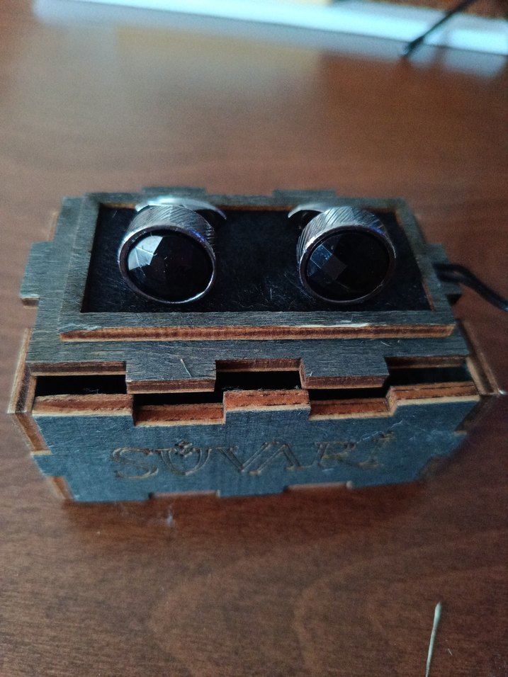 Suvari marka, siyah renkli, keskin yüzeyli erkek kol düğmeleri, ahşap kutuda sunulmuştur. Şık ve resmi kullanıma uygundur.