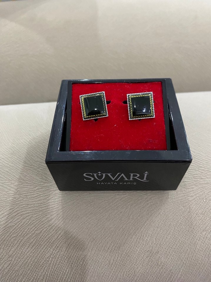 SUVARİ marka, modern klasik tasarıma sahip siyah kare kol düğmeleri. İş yaşamı için uygun, altın renkli kenar detayları ile şık görünüme sahiptir. ️