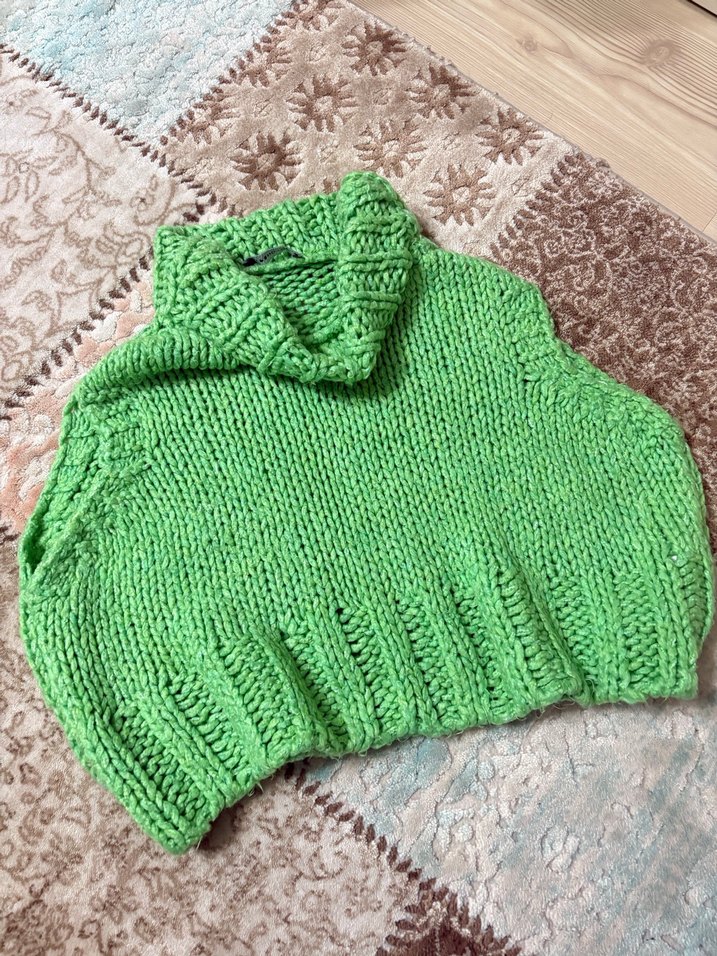 Yeşil renkli, örgü kız çocuk pançosu boğazlı ve uzun kolludur. Rahat kesimi ve sade tasarımıyla dikkat çeker.