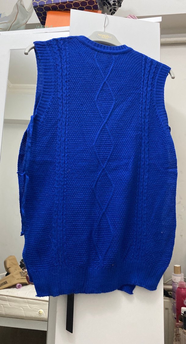 Mavi renkte, örgü dokulu, kolsuz ve balıkçı yaka tasarıma sahip, günlük kullanıma uygun rahat ve fitted kadın süveter.