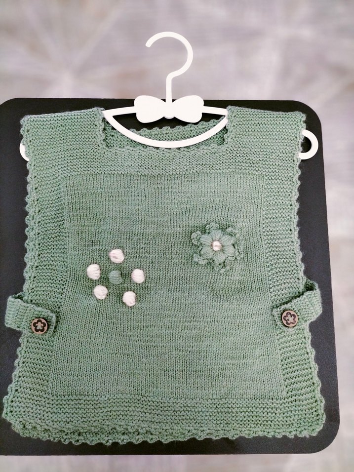 Gri tonlarda yumuşak örgü dokulu bebek önlüğü, küçük çiçek detayları ve ayarlanabilir düğmeli yanlara sahiptir.