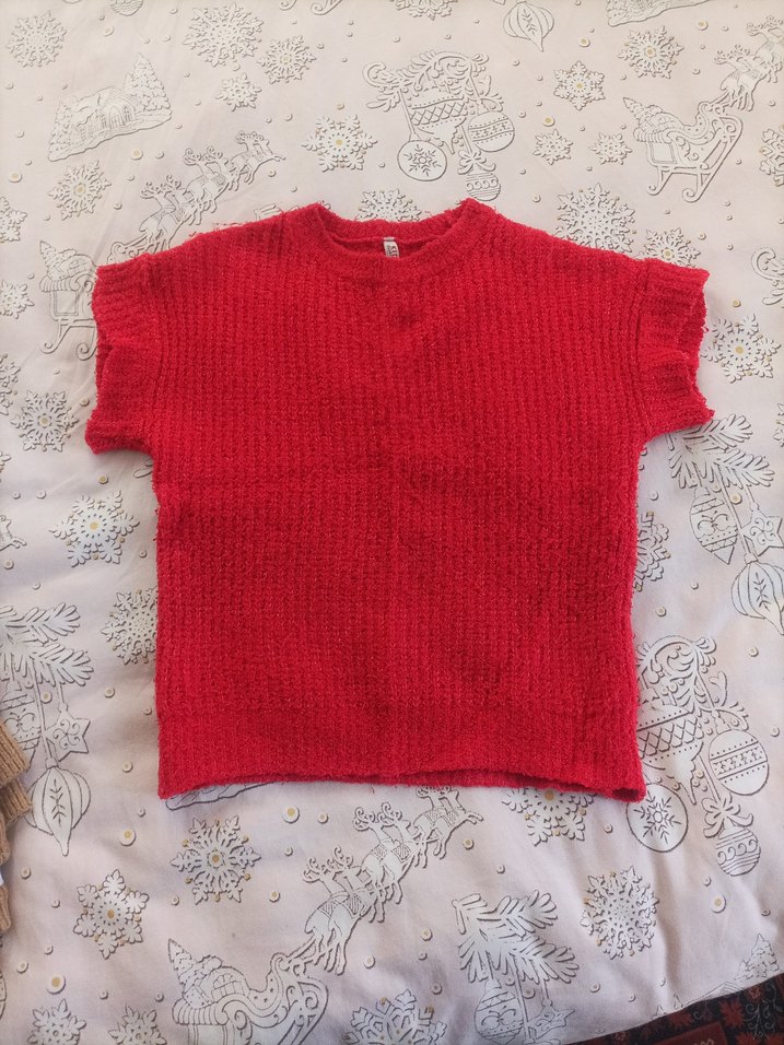 Kısa kollu, bisiklet yaka kırmızı örgü yelek Rahat kesimi ve normal boyuyla günlük kullanıma uygundur.