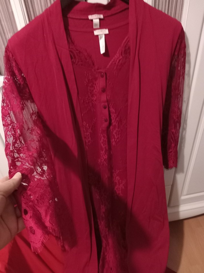 Suwen 40/42 beden Bordo renk sabahlık takım,içi kısa kollu ve güpürlü, dış sabahlıkta kolları güpürlü olarak çok şık duran takım, herhangi bir deformasyonu yoktur yeniden farksızdır şimdiden alıcısına güzel günlerde kullanması dileğimle...