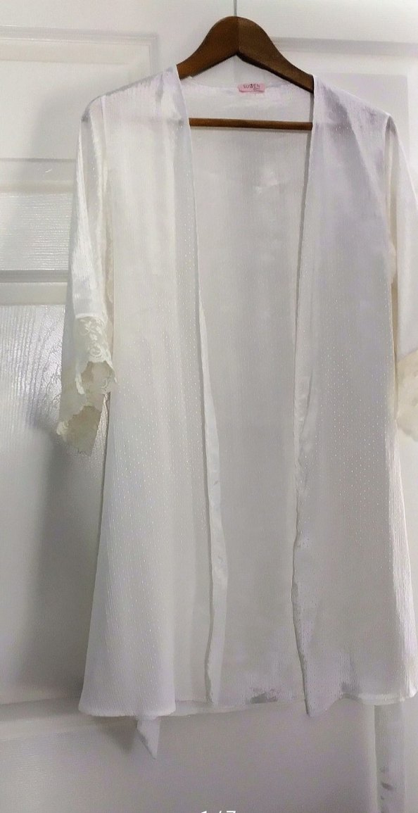 Beyaz, uzun boylu, bol kesim ve uzun kollu kadın sabahlığı, bohem Paris tarzında, desensiz ve hafif dokudadır. Oldukça yeni.Belden kuşaklı.36-37 beden.Uzunluk 83 cm.Bel kuşak çizgisinden etek ucuna uzunluk 42 cm.
