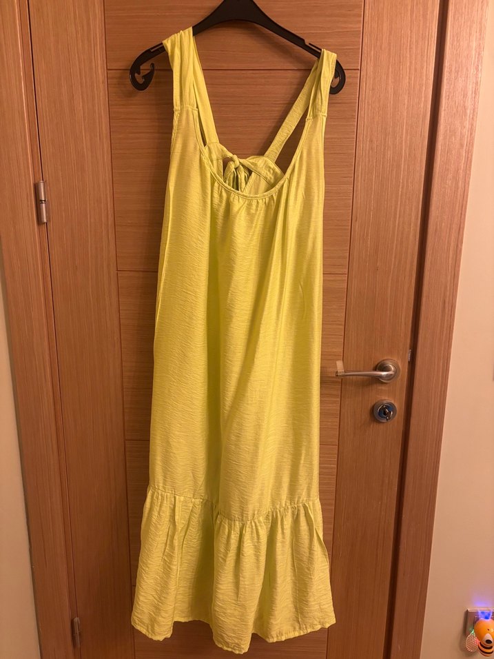 Suwen marka ince keten kumaştan yapılmış, deniz elbisesidir. Salaş kesim, drapeli detaylar ve parlak yüzey sunar, bohem tarzına uygundur. Herhangi bir kusuru yoktur.