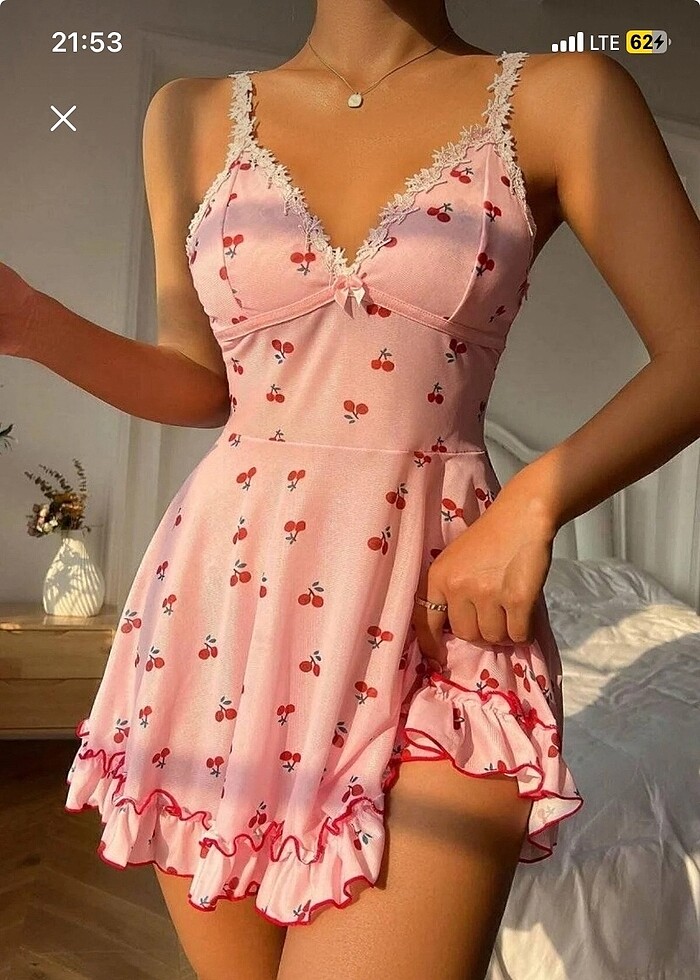 Kirazlı gecelik ve tanga. Hiç kullanmadım. Marka temsilidir.