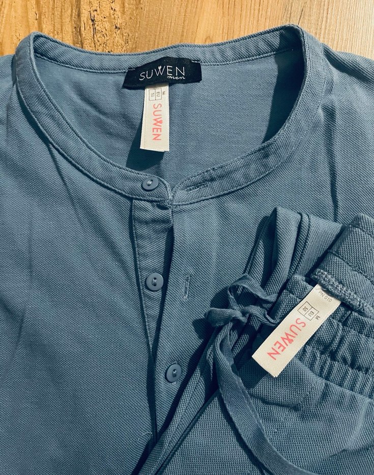 Mavi renkli, kısa kollu, düğmeli erkek pijama takımı. Salaş kesim, bisiklet yaka. Marka: SUWEN. Etiket fiyatı 2450 tl idi. Yıkandı ama hiç kullanılmadı.