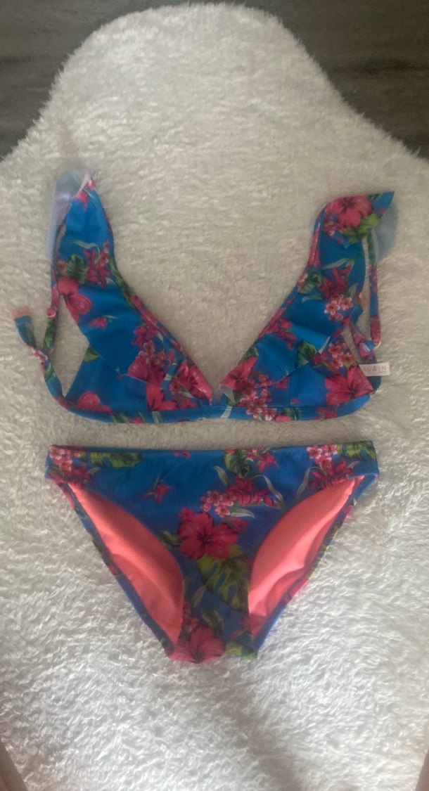 Suwen Mavi Çiçekli Fırfırlı Bikini Takımı üst 36 alt 40
