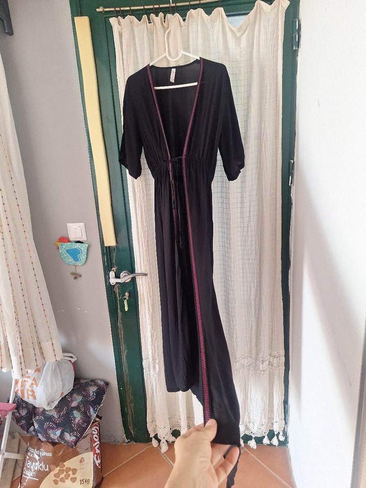 SUWEN S/M BEDEN UYUMLU PARE önü açıktır bağcıkları buzguludur yumusak kumastir askıda asılı iken omuzdan etek bitimi yaklaşık 136 cm dir etek kısmında iki taraf yirtmaci vardir