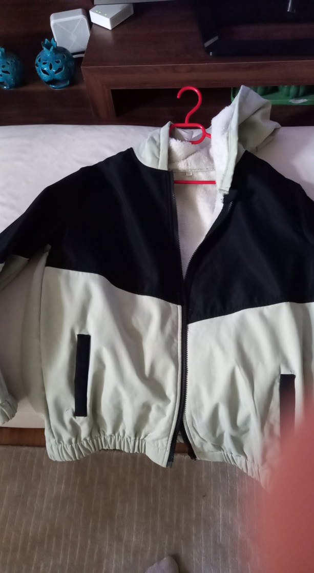 Kadınlar için bol kesim, uzun kollu ve yuvarlak yakalı kısa ceket. Fermuarlı ön ve yumuşak, sıcak kumaştan. suyeşili ve siyah renk bloklu, günlük sokak stili için ideal.