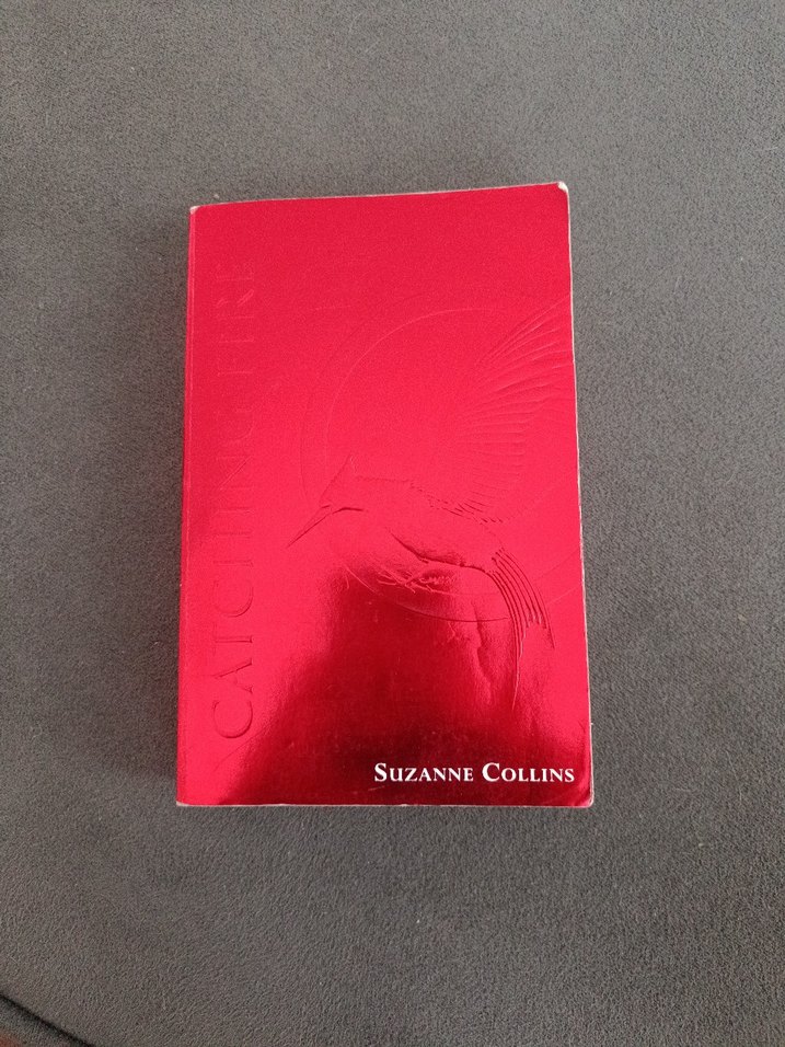 Suzanne Collins'in 'Catching Fire' adlı kitabı, kırmızı kapaklı ve kabartma kuş figürlü.