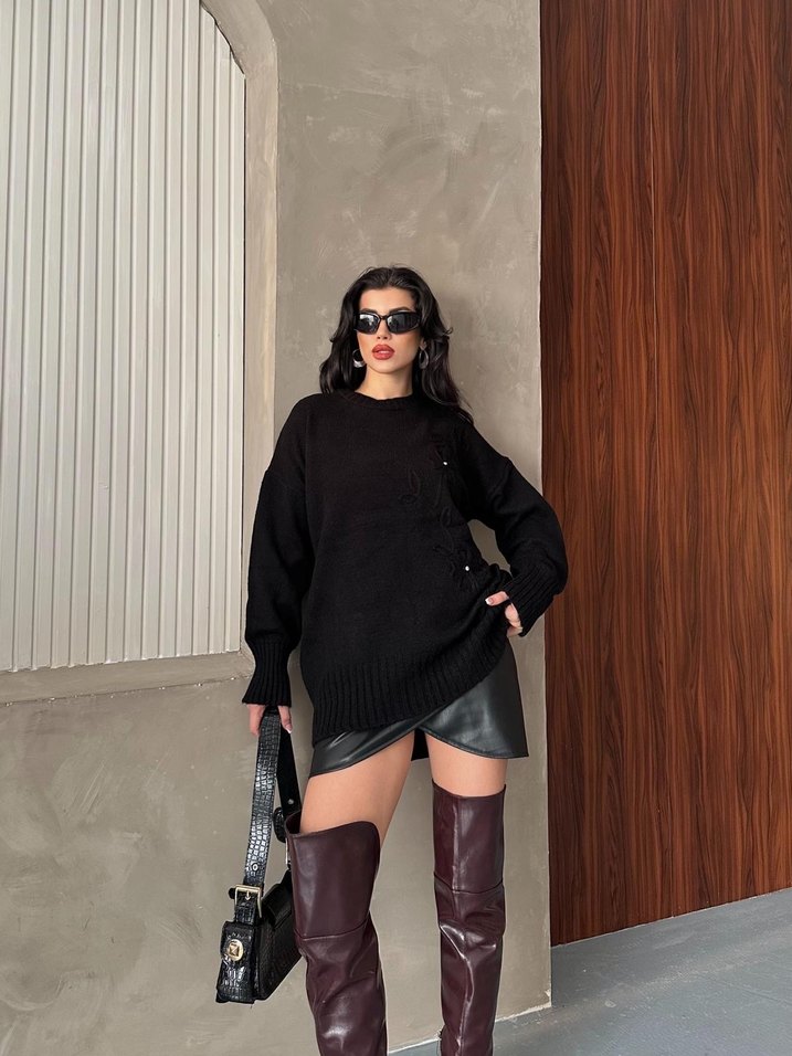Siyah uzun kollu, yüksek yakalı, bol kesim uzun kadın triko kazak. Sokak stiline uygun, günlük kullanım için rahat ve şık.