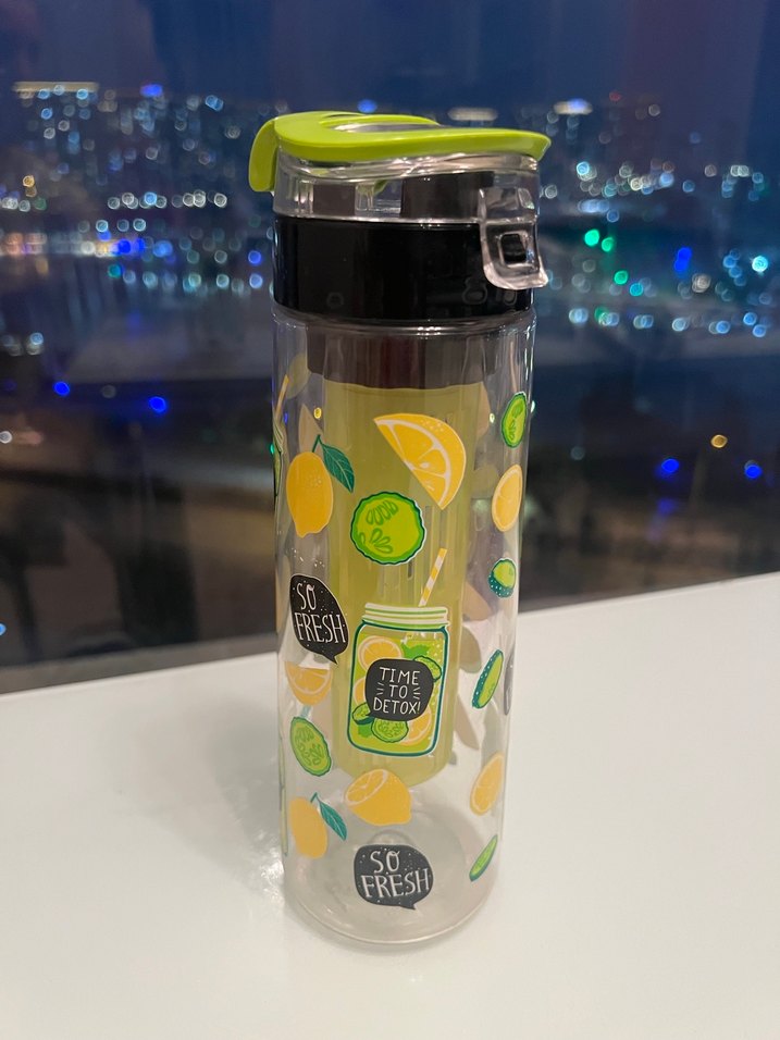 Renkli meyve desenli , detoks içecekleri için uygun. Hediye gelmiş, etiketi sökülmüştür.