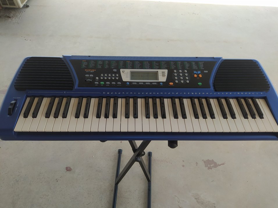 mavi dijital klavye, çeşitli ses seçenekleri ve kolay kullanım için LCD ekran içerir. Ayarlanabilir stand ile birlikte gelir.