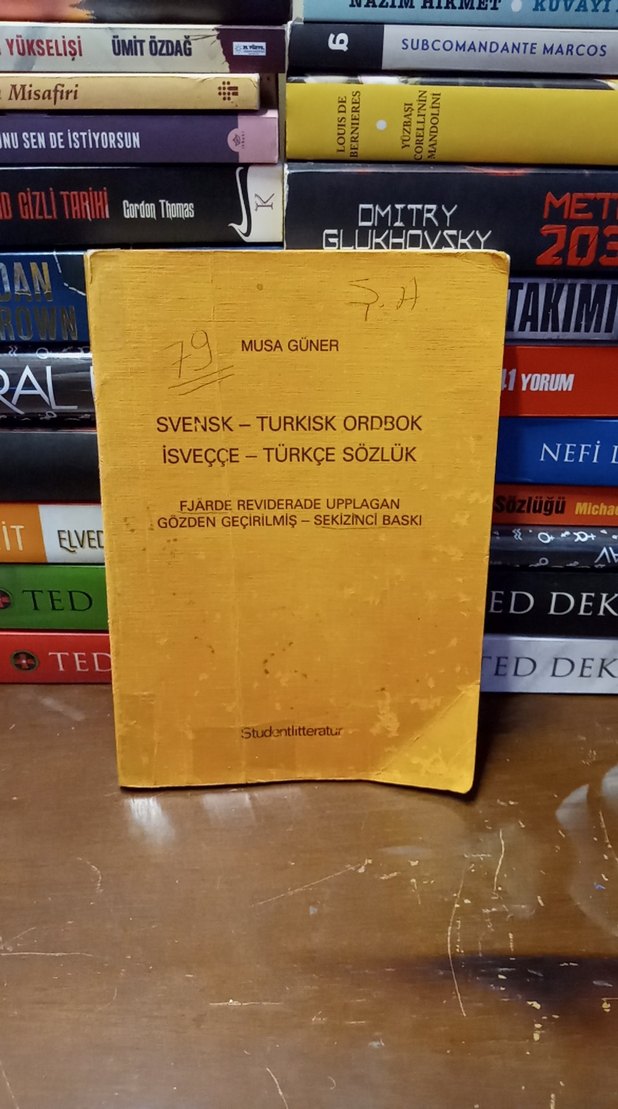 Musa Güner'in hazırladığı İsveççe-Türkçe sözlüğün sekizinci baskısı, sarı kapaklı ve okunaklı basımlı bir kitaptır.