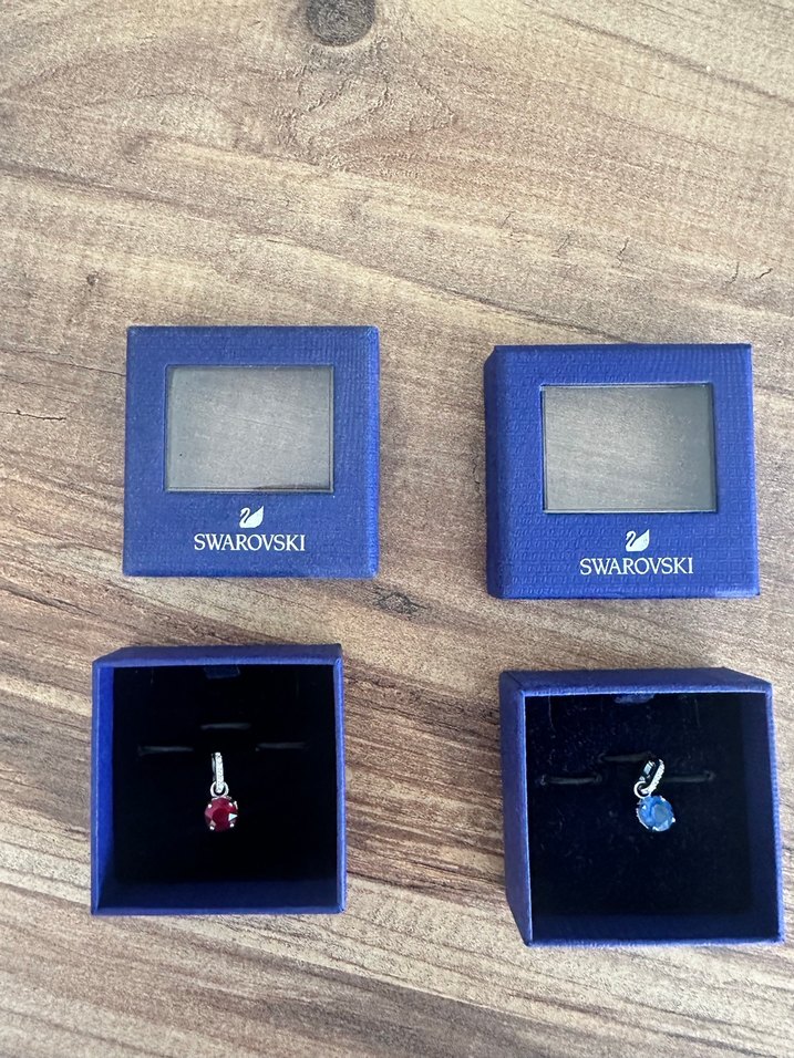 Orijinal belgesi var. Swarovski marka, koyu mavi ve bordo bileklik charmları, kolye ucu olarak da kullanılabiliyor