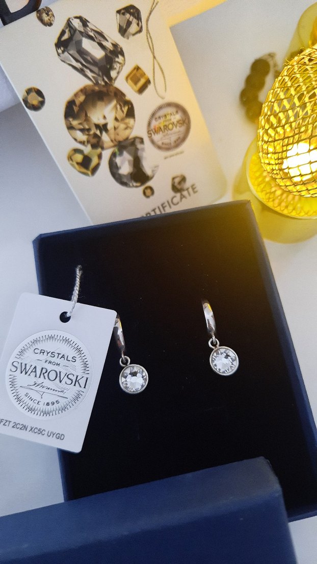 Minimalist, kısa uzunlukta beyaz Swarovski kristalleriyle süslenmiş modern tasarım küpeler. Düğünler için uygun, sade ve şık görünümlü.