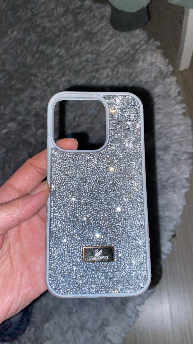 Gri renkte, Swarovski taşlarla süslenmiş, parlak ve taşlı yüzeye sahip streetwear tarzında telefon kılıfı. ✨
