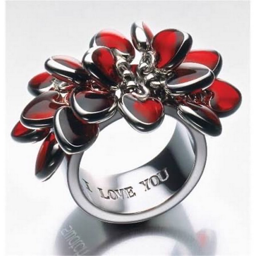 Parlak kırmızı kalp desenli kadın yüzük, iç kısmında 'I LOVE YOU' yazısı bulunur. Cesur ve gösterişli tasarımıyla romantik akşamlar için ideal. ❤️