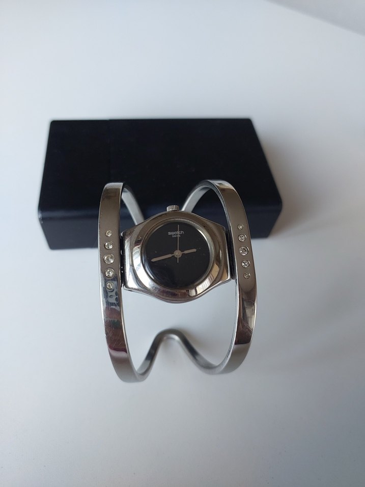 Swatch markalı kadın saati, tokalı ve minimalist tasarıma sahip. Siyah kadranlı, gümüş tonlu bilezik ve zarif kristal detaylarıyla klasik ve çağdaş tarzı yansıtıyor. ⌚sorunsuz çalışıyor