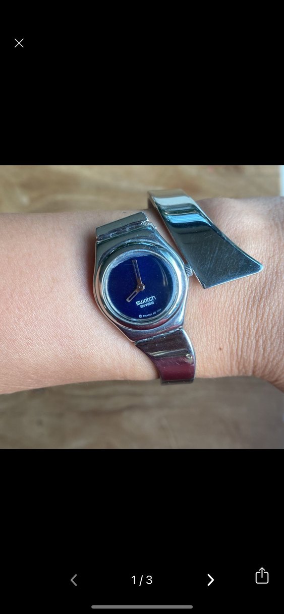 Swatch saat. Gümüş rengi kullanıma bağlı kusurları var resimde görünüyor. Pili yok. Orjinal bir model.