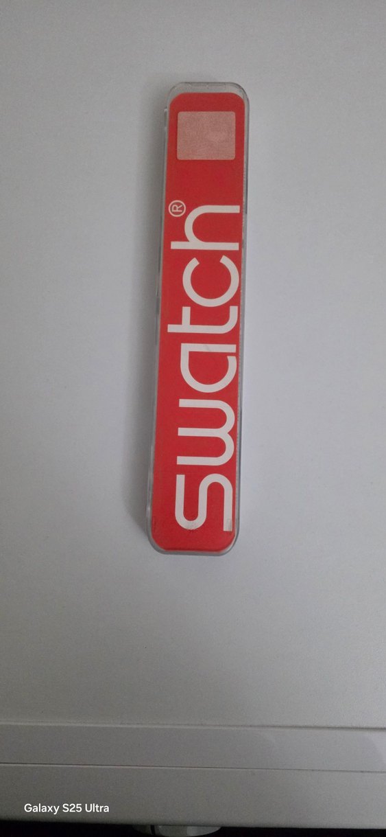 Gri zemin üzerinde beyaz marka logosu bulunan, minimalist ve sade tasarımlı kırmızı Swatch saat kutusu