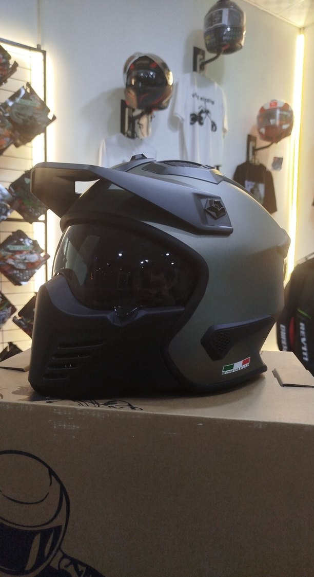 Gri renkte, kemerli ve çene çıkan bir özelliğe sahip metal görünümlü biker tarzı motosiklet kaskı, sokak stiline uygun.