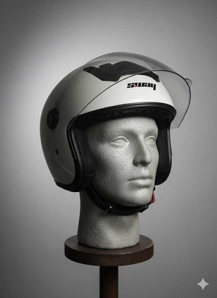 Beyaz baskılı motosiklet kaskı, tokalı kayışa sahip. Kauçuk malzemeden yapılmış, minimalist tarzda ve gri detaylı, rock punk havası uyuyor. ️sway marka bir kere kullanıldı temiz ve orjinal