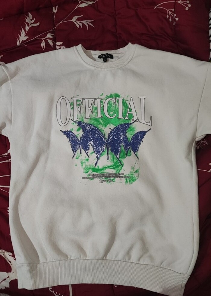 Beyaz sweat.Hicbir sorunu yoktur.4-5 defa giyildi.Gecen sene kutu butikten almıştım.