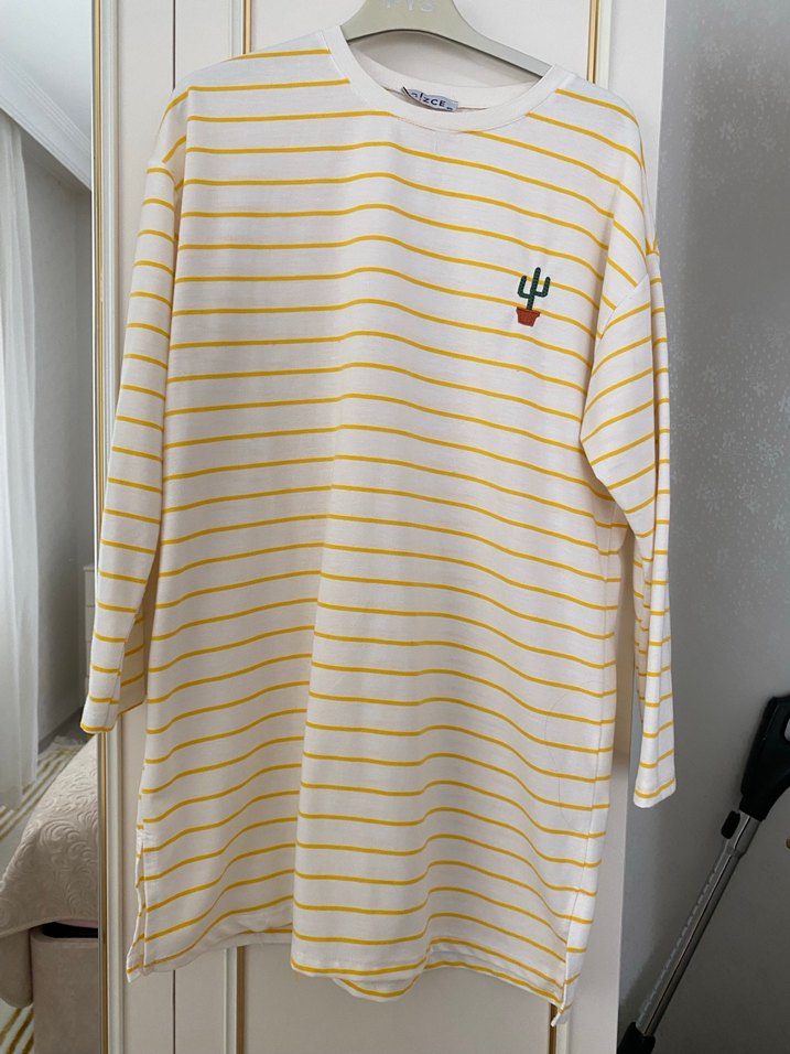 Pamuk kumaştan, uzun kollu, yuvarlak yakalı, sarı çizgili bol kesim hamile tişörtü. Düğme detaylı ve küçük kaktüs nakışlı, günlük rahat sokak stili için uygundur.