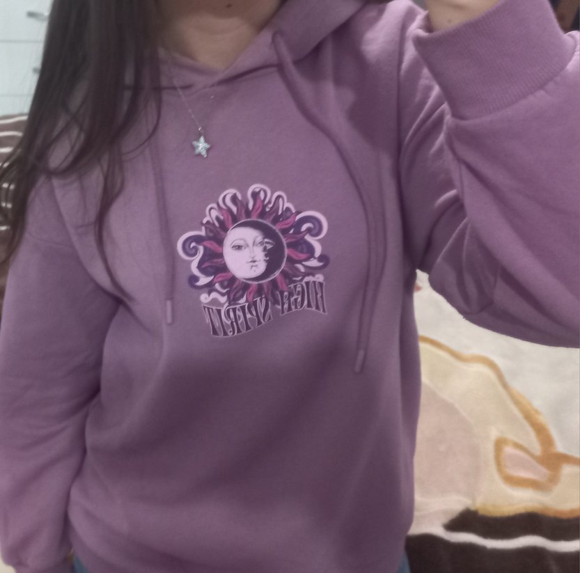 S beden, az giyildi Yumuşak polar kumaştan, bol kesim, uzun kollu mor sweatshirt. Üzerinde baskılı güneş ve ay deseni bulunur.