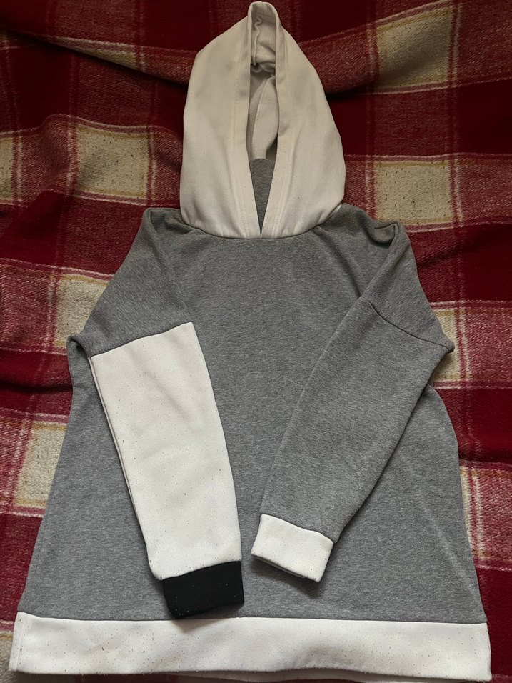 Kadınlar için gri ve beyaz detaylı, bogazlı ve kapüşonlu, uzun kollu, salaş kesim sweatshirt. Yumuşak ve rahat kumaştan, günlük kullanıma uygun. Herhangi bir deformesi bulunmuyor