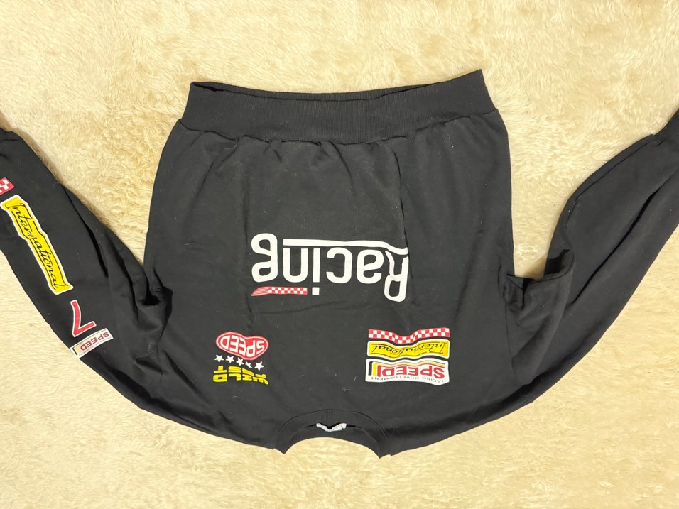 Baskılı yarış temalı grafiklere ve tokalı detaylara sahip siyah bol kesim , tekstil kumaştan, sportif sokak stili için uygun.