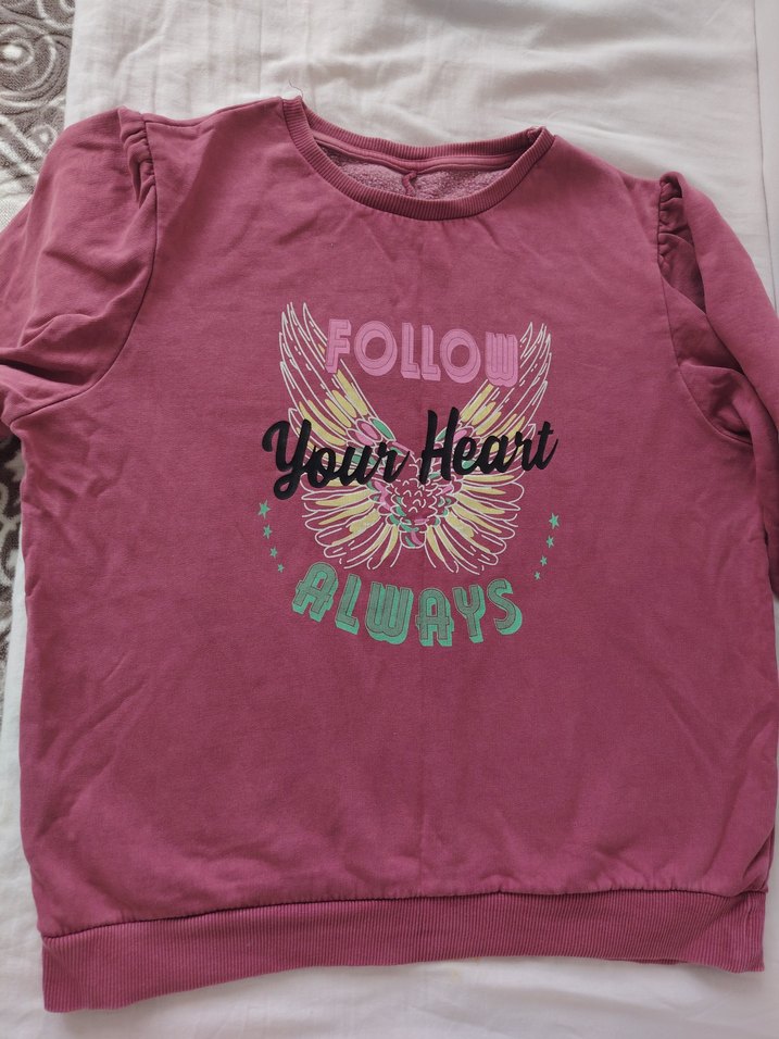 Uzun kollu, yuvarlak yakalı pembe pamuk sweatshirt, renkli baskı ve dantel detaylıdır. Üzerinde "Follow Your Heart Always" yazısı bulunur.