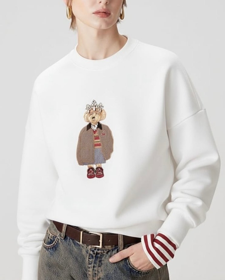 Uzun kollu, bol kesim beyaz sweatshirt, nakışlı örgü ayı desenli ve çizgili manşetlere sahip. Rahat ve günlük kullanıma uygun.