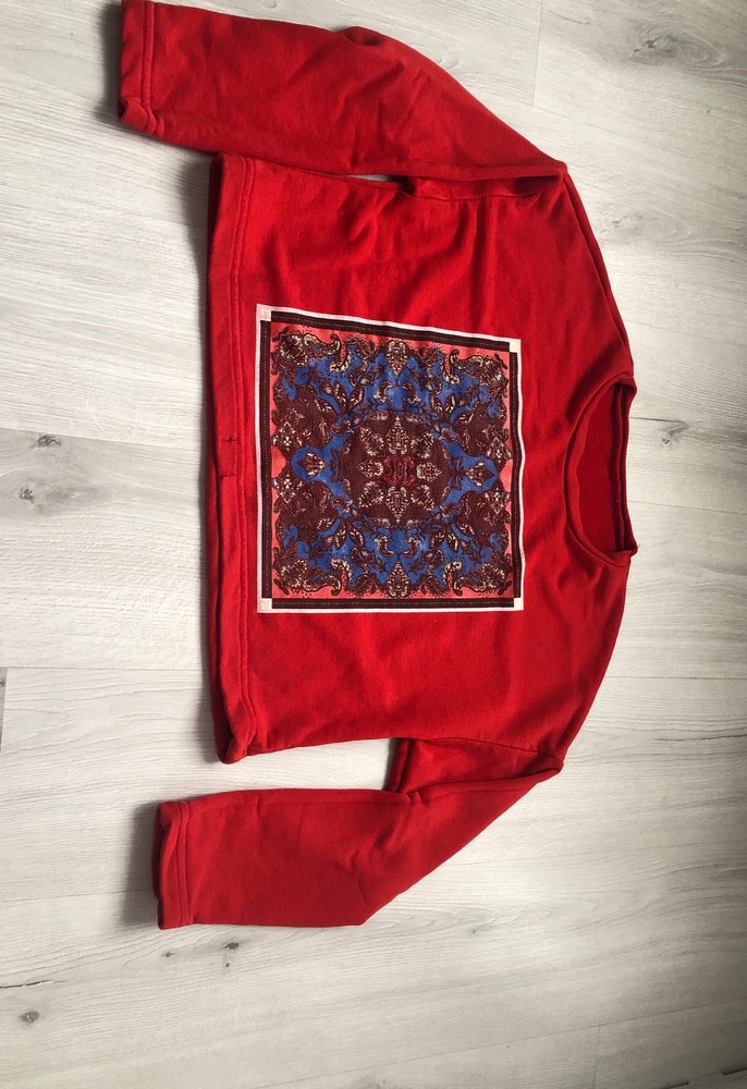 Kırmızı, uzun kollu, yuvarlak yaka ve bol kesim kadın sweatshirtü. Önünde etnik desen baskısı bulunur, günlük kullanıma uygundur. Bir sorunu yoktur Makul tekliflere açığım