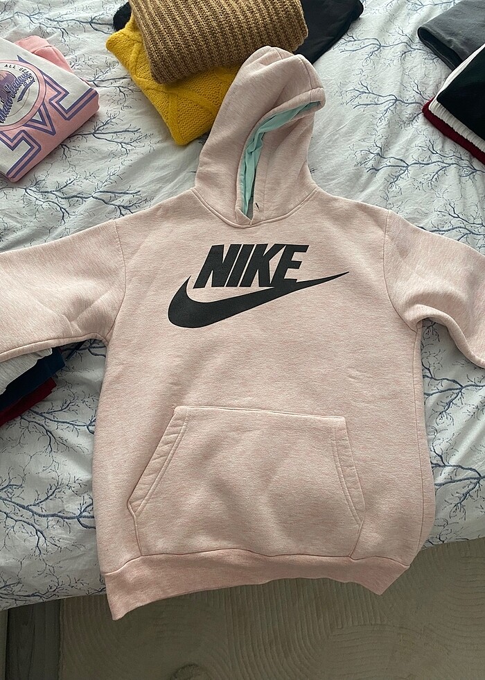 Üç iplik şardonlu kalın sweat. Nike yazısında çok hafif solukluk. Az kullanıldı. M ve l beden uyumlu toz pembe rengi