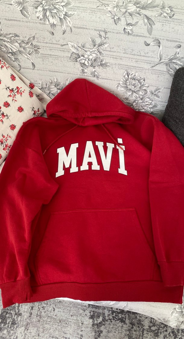 Kırmızı kapüşonlu sweatshirt, bol kesim ve uzun kolludur.