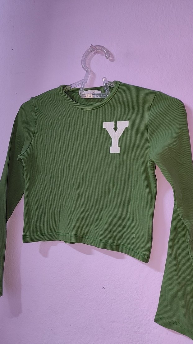 Koyu yeşil renkli, uzun kollu ve yuvarlak yakalı crop. Göğüs kısmında beyaz 'Y' detayı bulunur, yumuşak sentetik kumaştan üretilmiştir.