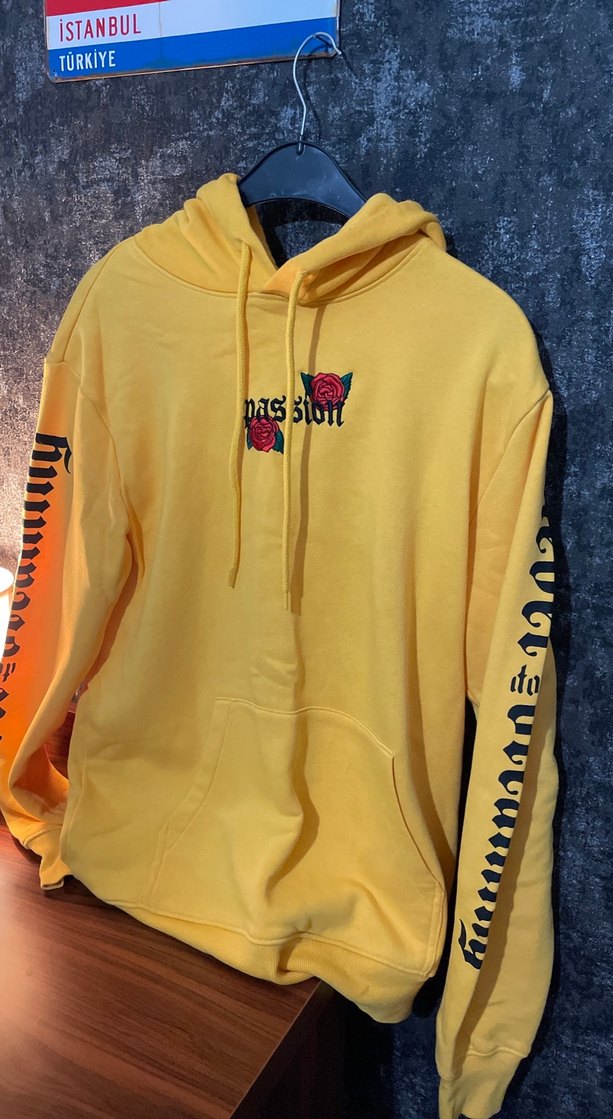 Sarı kapüşonlu, uzun kollu ve bol kesim sweatshirt. Göğüs ve kollarda baskılı desenler, fermuarlı detay ve yumuşak, sıcak kumaş içerir. Rahat kullanım için uygundur.
