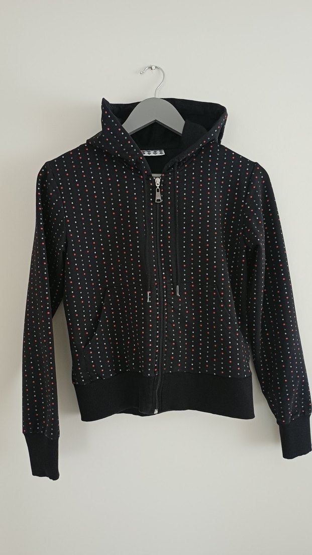 Neredeyse sıfır gibi. Yıkandı fakat hiç giyilmedi. Yumuşacık kumaşı var. Bedeni 40 fakat 38 bedende daha iyi durur. #sweat #Sweatshirt #puantiyeli #siyah #crop #kapüşonlu #fermuarlı
