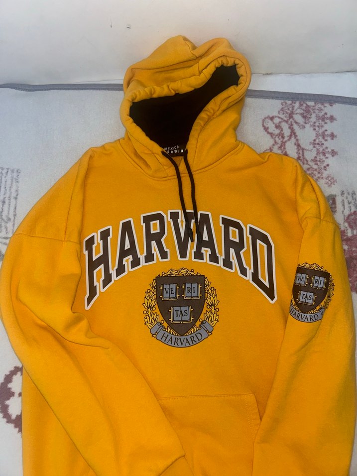 Sarı kapüşonlu sweatshirt, bol kesim, uzun kollu ve Harvard baskılıdır. Yumuşak, sıcak dokuludur.