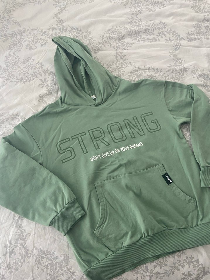 Hiç kullanılmamıştır. yeşil kapüşonlu sweatshirt, uzun kollu ve bol kesim. Yumuşak ve sıcak kumaştan, önünde gri "STRONG" baskısı ve "DON'T GIVE UP ON YOUR DREAMS" yazısı vardır. Spor ve günlük kullanıma uygun.